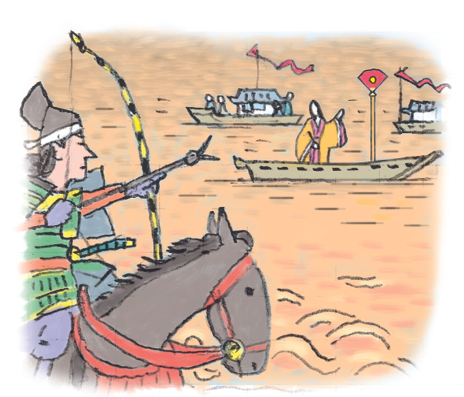 敵(てき)である平家(へいけ)も、味方(みかた)の源氏(げんじ)の兵士(へいし)たちも大歓声(だいかんせい)を上(あ)げて与一(よいち)をたたえた。